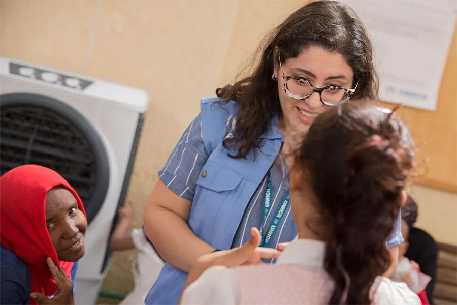 Farah Nasef est une Volontaire des Nations Unies assistante à la protection de l’enfance travaillant pour le Haut-Commissariat des Nations Unies pour les réfugiés (HCR) en Égypte. Elle accompagne les enfants et les personnes relevant de sa compétence dans les situations de crise, dans un centre d’accueil du HCR situé dans la Cité du 6 octobre, au Caire.(Amr Abdelazez et Mohamed Sabry/UNV, 2018)