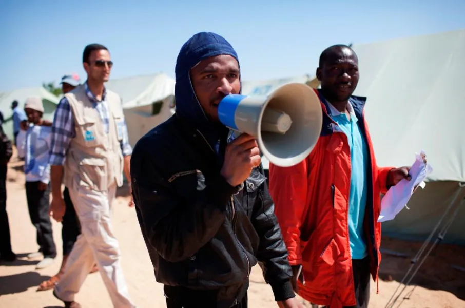Des bénévoles, accompagnés d’un membre du personnel du HCR, utilisent un mégaphone pour appeler des Nigérians à un point de traitement du camp de Choucha à Ras Djir, en Tunisie. Le HCR a établi une présence pour répondre à l’afflux massif de personnes traversant la frontière tunisienne pour fuir les violences en Libye (Jason Tanner / HCR, 2011).